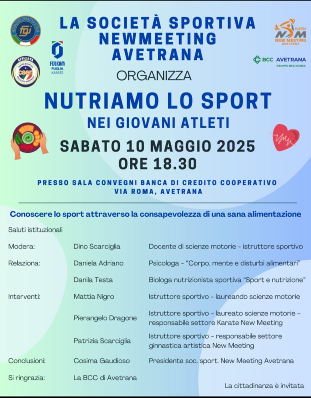 Relazioneranno Daniela Adriano, psicologa, sul tema “Corpo, mente e disturbi alimentari”; Danila Testa, biologa nutrizionista sportiva, sul tema “Sport e nutrizione”. Seguiranno gli interventi di Mattia Nigro, istruttore sportivo, laureando in Scienze Motorie; Pierangelo Dragone, istruttore sportivo, laureato in Scienze Motorie, responsabile del settore Karate della New Meeting Avetrana; Patriizia Scarciglia, istruttrice sportivo, responsabile del settore Ginnastica Artistica della New Meeting Avetrana. Le conclusioni saranno tratte da Cosima Gaudioso, presidente della società sportiva della New Meeting Avetrana.