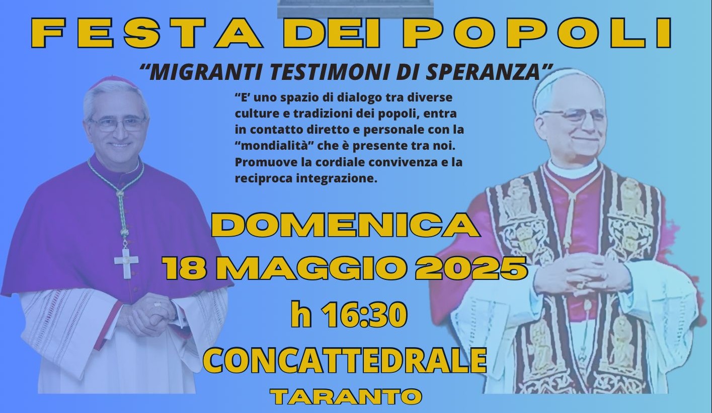 «In quest’anno giubilare – ha spiegato Marisa Metrangolo, direttore dell’Ufficio diocesano Migrantes, annunciando l’evento – la Festa dei Popoli diocesana, che giunge a pochi giorni dalla elezione di Papa Leone XIV, è dedicata al Giubileo dei Migranti che sarà celebrato, insieme al Giubileo del Mondo Missionario, sabato 4 e domenica 5 ottobre 2025 a Roma. Questa data è stata scelta perché si celebra anche la 111ª della Giornata Migranti e Rifugiati 2025 il cui tema è “Migranti, missionari di speranza”, scelto da Papa Francesco perché ‘molti migranti e rifugiati sono testimoni della speranza attraverso il loro affidarsi a Dio’».