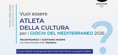 Nuovo appuntamento nell’ambito dell'ottava edizione della Mostra del Cinema di Taranto. Al via il primo di una serie mensile di incontri dal titolo “Vuoi essere Atleta della Cultura per i Giochi del Mediterraneo 2026?”, che si terrà giovedì 15 maggio alle ore 18 a palazzo Pantaleo in corso Vittorio Emanuele II nella Città vecchia di Taranto.