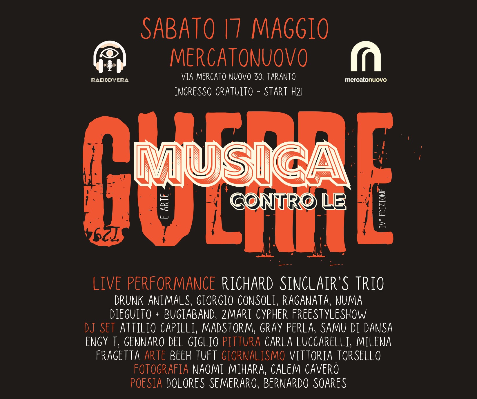 L'evento organizzato da RadioVera aps si terrà sabato 17 maggio dalle ore 21 presso Mercato nuovo, via Mercato nuovo in zona Porta Napoli. Protagonista della narrazione musicale sarà l'artista di fama internazionale Richard Sinclair che salirà sul palco in formazione trio accompagnato da Francesco Festinante ed Angelo Losasso, ed ancora spazio al rock, al pop, al blues ed al reggae con in Drunk Animal, RaganaTa ed altri artisti tarantini come Remigio Furlanut, Numa, Dieguito accompagnato dalla BugiaBand, Giorgio Consoli e 2Mari Cypher con una esibizione free style.