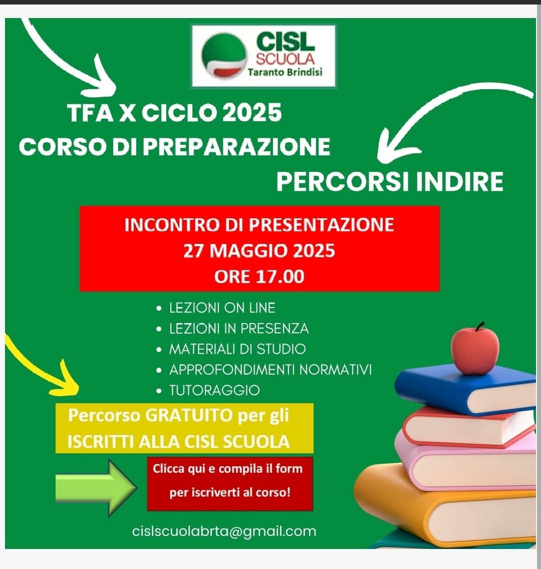 La CISL Scuola Taranto Brindisi ha organizzato il Corso di Preparazione al X Ciclo TFA sostegno e Percorsi INDIRE.