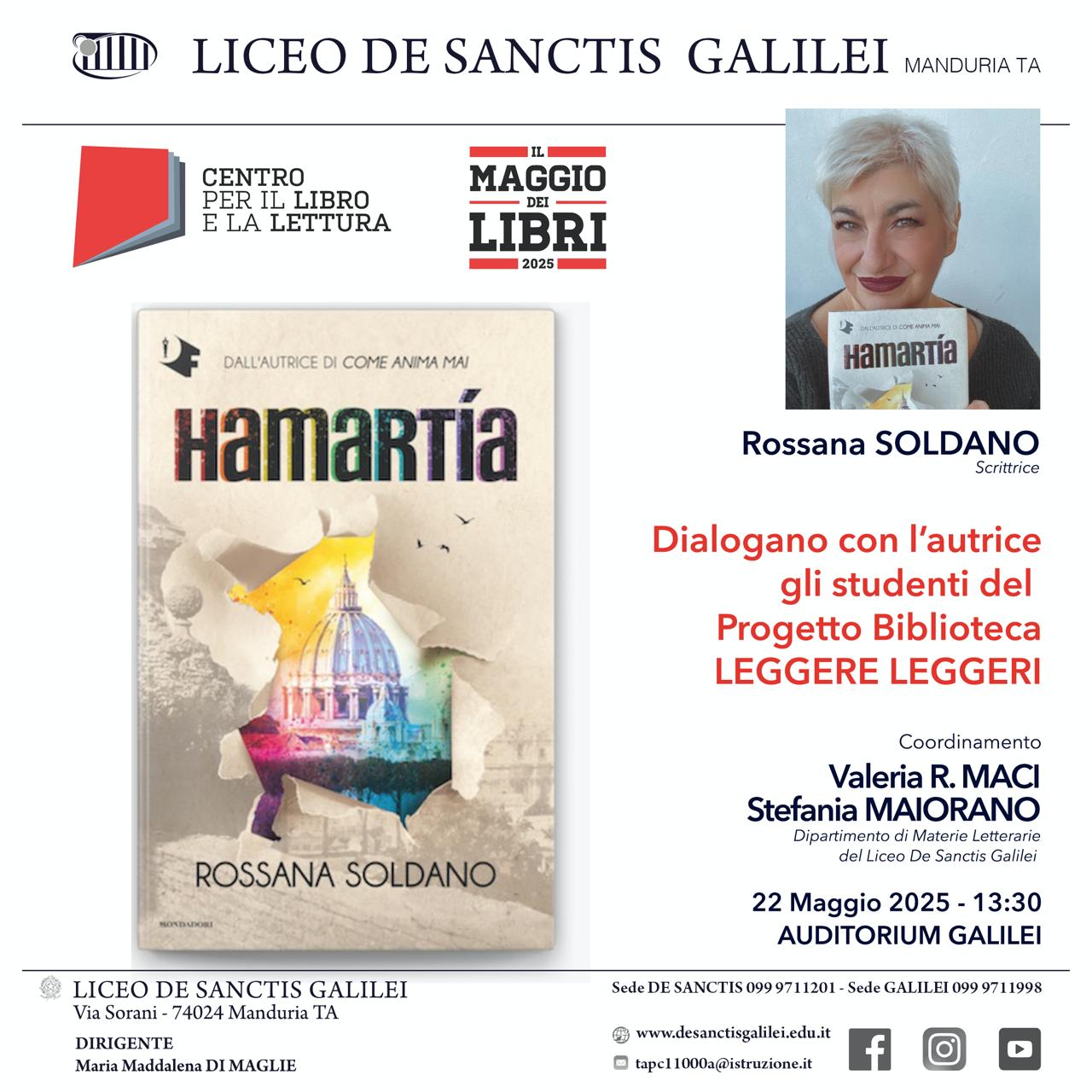 Il liceo De Sanctis-Galilei di Manduria si conferma presidio culturale e promotore della lettura tra i più attivi del territorio. Giovedì 22 maggio, alle ore 13:30, nell’auditorium della sede Galilei, gli studenti incontreranno la scrittrice e giornalista Rossana Soldano, ospite d’eccezione nell’ambito del progetto “Il Maggio dei Libri” promosso dal Centro per il Libro e la Lettura.