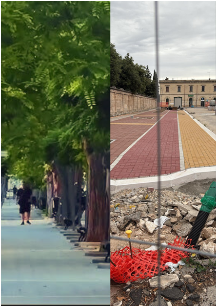 Il cemento cancella l’aspetto storico in pietra del viale. Il PPTR Puglia prescrive il mantenimento della “continuità materica” nelle urbanizzazioni dei centri storici, privilegiando la pietra locale rispetto ai materiali industriali. L’esperienza recente di Manduria (ricordiamo le proteste per lo scempio dell’uso della bitumazione del centro storico) dimostra la forte sensibilità dei residenti verso il ripristino del basolato in chianca. L’introduzione di blocchi in calcestruzzo vibro-compresso altererebbe il carattere identitario del viale, ponendosi in contrasto anche con l’art. 136 Codice dei Beni Culturali e con la giurisprudenza della Soprintendenza sul “materiale d’imitazione”.Procederemo a segnalare alla Sovrintendenza tale anomalia.