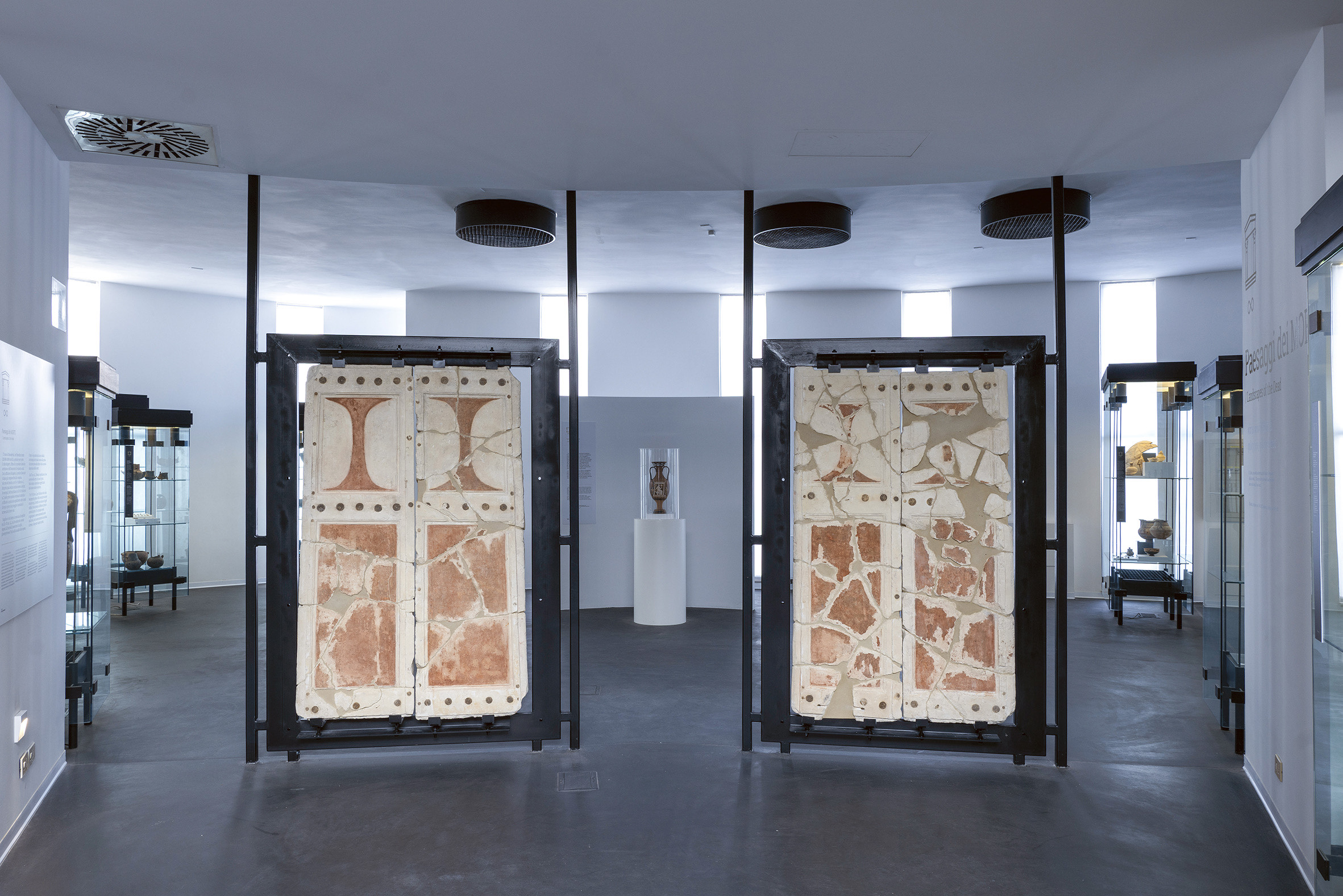 Le Porte sono state definite quale “uno degli esempi maggiori dell’architettura funeraria nella Puglia prima di Roma” e si trovavano in un ipogeo ellenistico databile nella seconda metà del IV secolo a.C. «Dal suo elemento di maggior spicco potremo indicarlo come “Ipogeo delle Porte Dipinte”» scrive il professore emerito di UniSalento Francesco D’Andria nel contributo in apertura del volume che illustra l’intervento di restauro, le indagini e le ricerche che hanno accompagnato e permesso la realizzazione del nuovo allestimento e la restituzione al pubblico delle “Porte Dipinte di Rudiae” al Museo Castromediano.