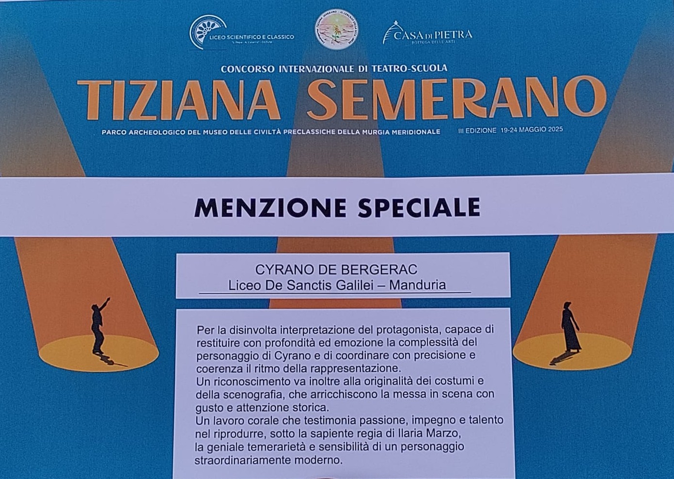 La rassegna, articolata in più giornate, unisce spettacoli, incontri formativi, laboratori e momenti di dialogo tra giovani provenienti da realtà scolastiche e culturali diverse. A essere premiati, oltre al valore scenico, sono l’originalità del progetto, la qualità dell’allestimento, il contenuto etico e formativo, e la capacità di coinvolgere il pubblico. In questo contesto competitivo e stimolante, la menzione speciale attribuita allo spettacolo Cyrano de Bergerac del Liceo De Sanctis-Galilei di Manduria conferma il valore e la qualità del progetto Liceinscena, fiore all’occhiello dell’offerta formativa del liceo.