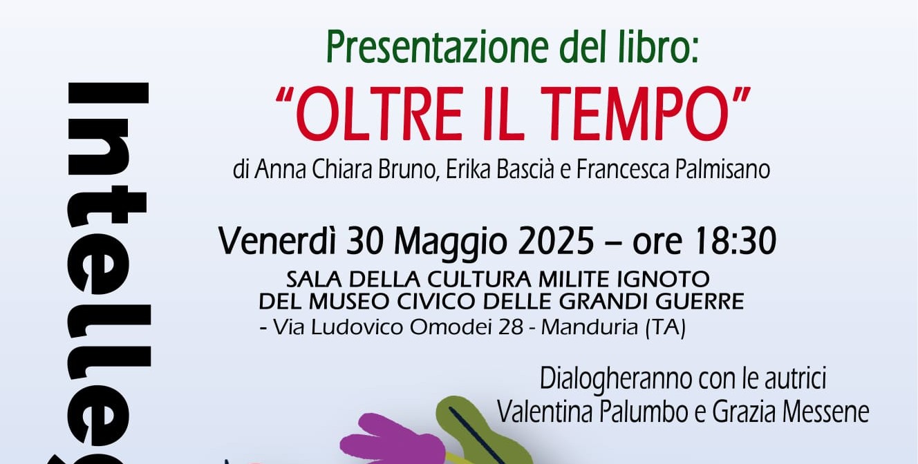 Il prossimo appuntamento della Pro Loco di Manduria è venerdì 30 maggio, alle ore 18.30, presso la sala della cultura “Milite Ignoto” del museo civico delle Grandi Guerre (in via Ludovico Omodei 28), con la presentazione, in collaborazione con l’associazione "Cicatrici", del libro “Oltre il tempo” di Anna Chiara Bruno. L’opera, che include i contributi di Erika Bascià e Francesca Palmisano, è dedicata al disagio giovanile e alle numerose problematiche che affliggono i ragazzi durante la crescita.
