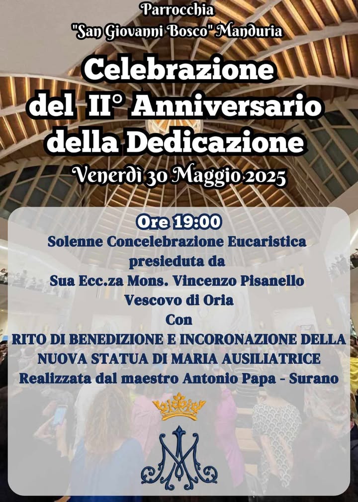 Nel programma delle celebrazioni in occasione del II anniversario della dedicazione, venerdì sera, alle ore 19, nella parrocchia San Giovanni Bosco di Manduria avrà luogo la solenne concelebrazione eucaristica presieduta da mons. Vincenzo Pisanello, vescovo di Oria, con rito di benedizione e incoronazione della nuova statua di Maria Ausiliatrice realizzata dal maestro Antonio Papa di Surano.