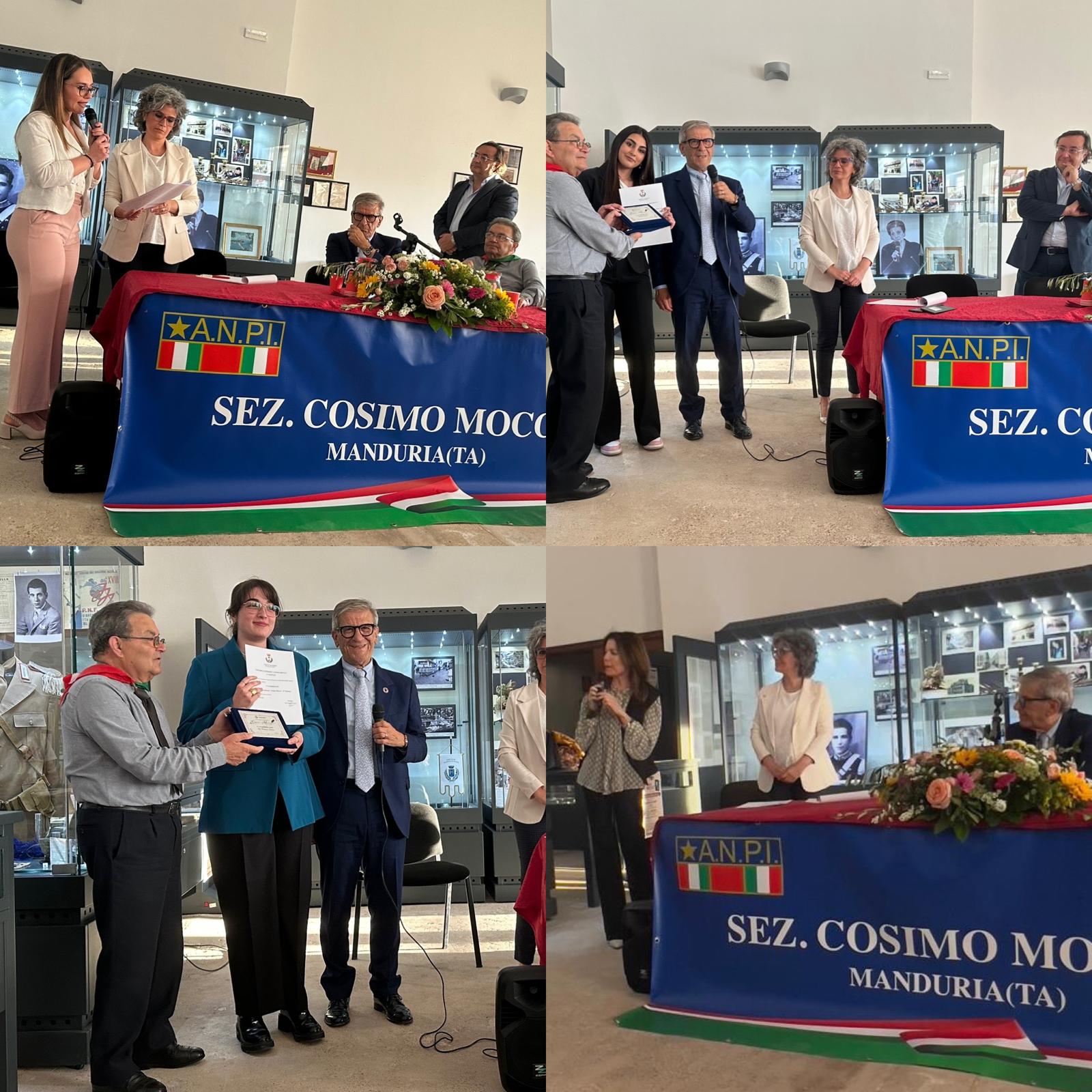 Ieri sera si è svolta la premiazione della III edizione del concorso letterario intitolato al partigiano solidale Cosimo Moccia, indetto dal Comune di Manduria in collaborazione con l’Associazione Nazionale Partigiani Italiani, con il coinvolgimento degli studenti delle classi quinte degli istituti scolastici di 2° grado del territorio, chiamati a redigere un saggio partendo da una citazione di Sandro Pertini quale spunto per riflettere sul significato di “sacrificio eroico”.