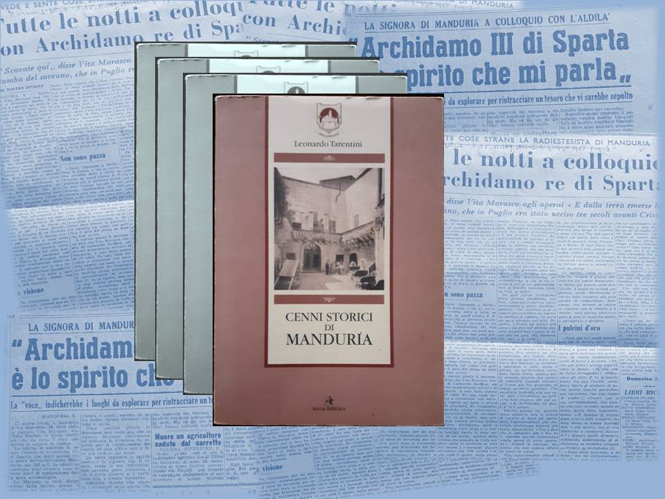 BIBLIOGRAFIA: Tarentini L., “Cenni storici di Manduria-Casalnuovo”, ristampa anastatica, Atesa ed., Bologna 1996; “Roma”, 5 luglio 1955; “Il Giornale d’Italia”, 8 agosto 1955.