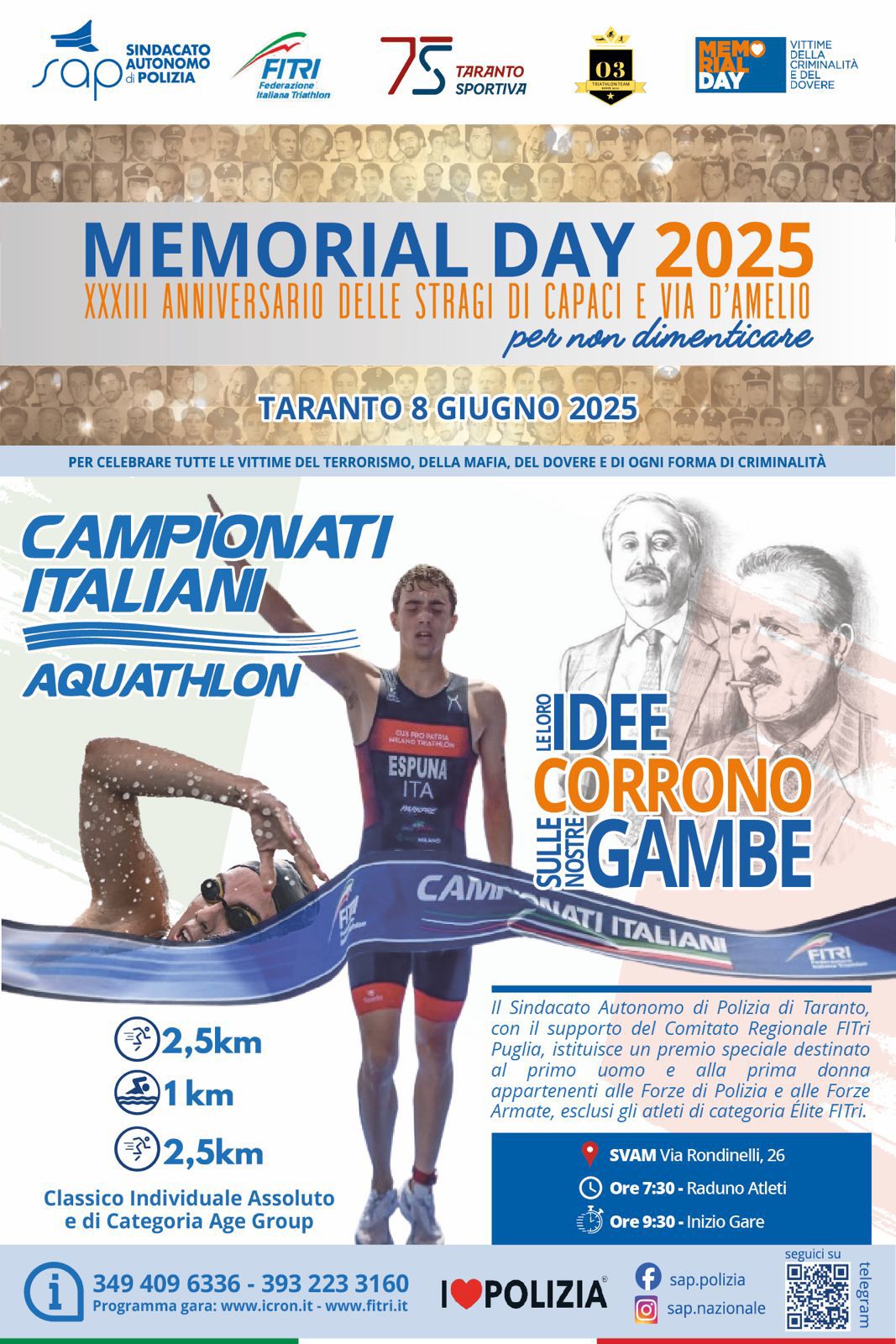L’evento sarà celebrato domenica 8 giugno, alle ore 9,30, in via Rondinelli 26 a Taranto presso la SVAM, dove si svolgeranno delle gare valevoli per i campionati italiani di Aquathlon.