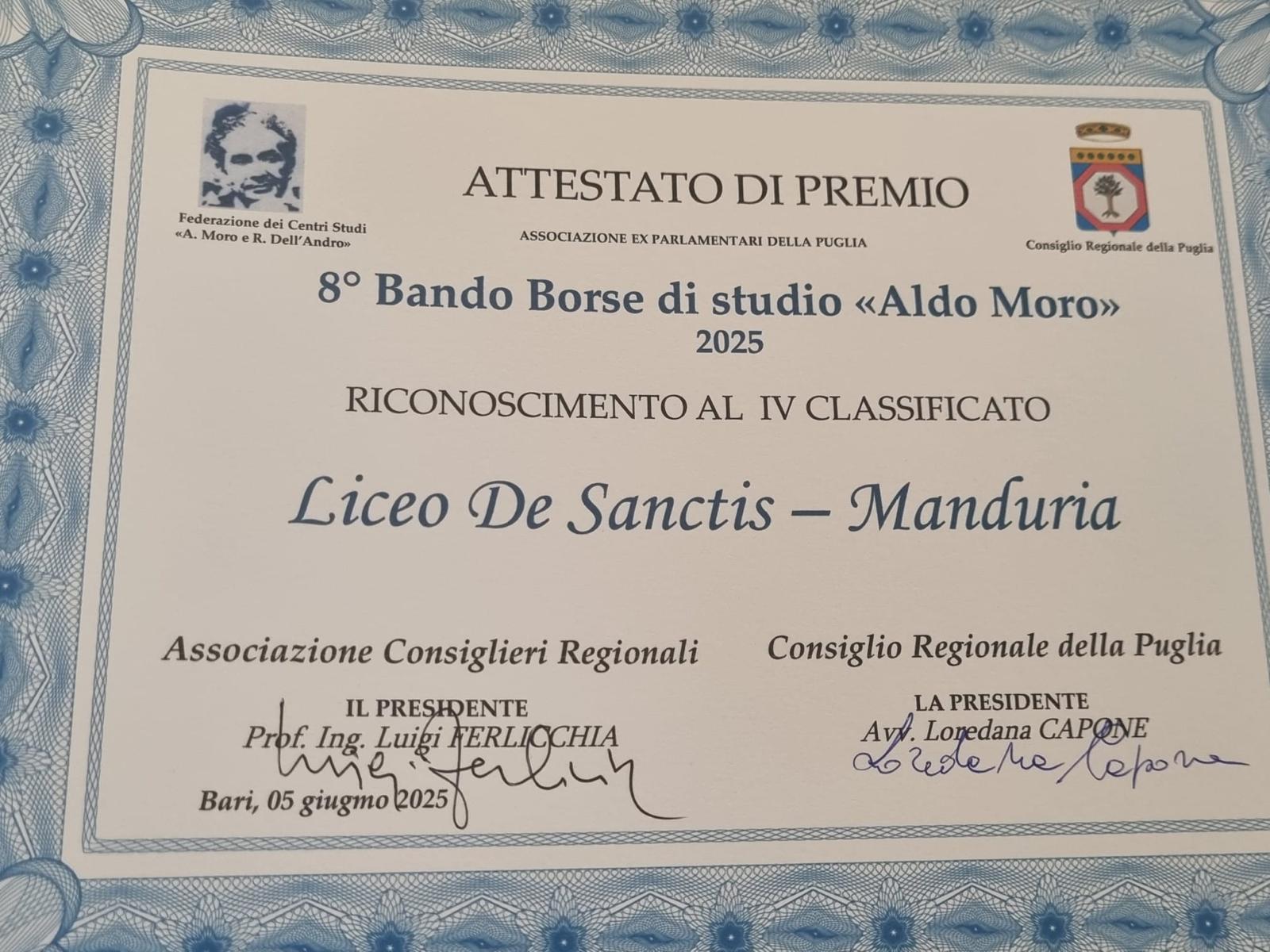 Si è svolta presso l’aula consiliare del Consiglio regionale della Puglia, a Bari, giovedì 5 giugno, la cerimonia di premiazione dell’ottava edizione del Concorso nazionale per le borse di studio “Aldo Moro”, rivolto agli studenti delle scuole superiori e delle università italiane. Tra i vincitori di quest’anno, anche due studenti del liceo De Sanctis-Galilei di Manduria: Francesco Greco e Agnese Fazzi, della classe 3ª A del liceo Classico, che si sono classificati al quarto posto su 72 partecipanti provenienti da tutta Italia.