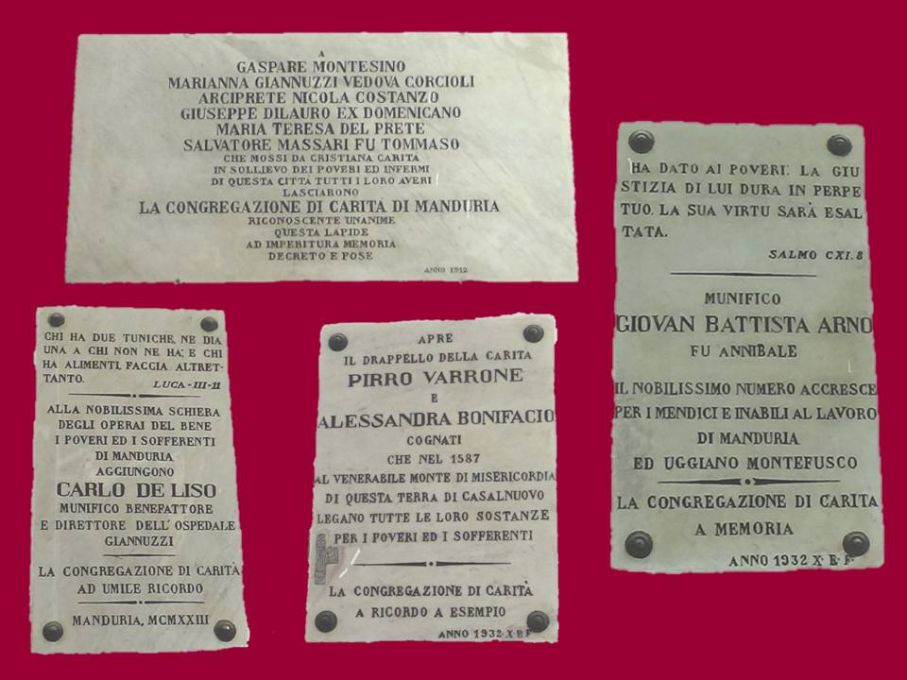 D’Ippolito Lucia, “L’ospedale ‘Marianna Giannuzzi’ di Manduria: le origini” in “Liber amicorum – Miscellanea di studi storici offerti a Rino Contessa”, a cura di Giovangualberto Carducci, Filo editore, 2 voll. tomo I, pp. 413-466; Brunetti Pietro, “Manduria tra storia e leggenda – dalle origini ai giorni nostri”, Barbieri/Selvaggi editori 2007; Tarentini L., “Manduria Sacra”, a cura di Elio Dimitri, Barbieri editore 2000; Tarentini L., “Cenni storici di Manduria”, Atesa Editrice, Bologna 1996.