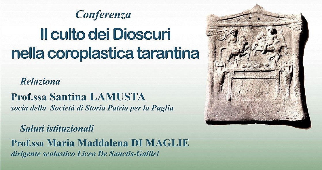 “Il mito dei Dioscuri nella coroplastica tarantina” sarà quindi il tema della relazione che la prof.ssa Santina Lamusta terrà, lunedì 16 giugno, alle ore 19, presso l’aula magna del liceo classico “F. De Sanctis”. L’affascinante mito di Castore e Polluce, figli di Leda e la relativa raffigurazione nella coroplastica tarantina ci parleranno pertanto dell’antico ed indissolubile legame culturale di Taranto, unica colonia spartana , con la madrepatria. Un tema avvincente, che ci auguriamo possa essere attrattivo per studenti e pubblico interessato.
