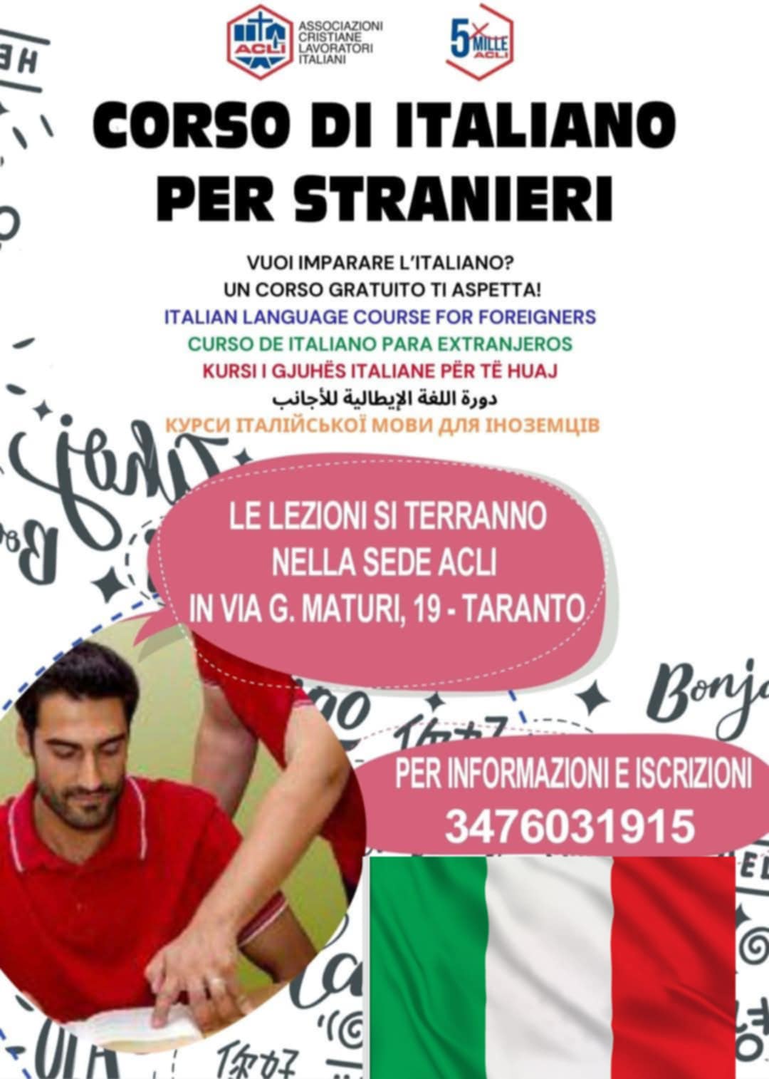 Le ACLI Provinciali di Taranto comunicano che a partire da martedì 17 giugno e sino a luglio inoltrato avrà luogo un corso gratuito di italiano base rivolto a cittadini stranieri residenti sul territorio. L’iniziativa è interamente finanziata con la somma del 5×mille devoluta all'associazione mediante dichiarazioni dei redditi.