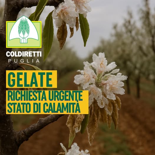 Bene la richiesta di declaratoria di calamità naturale per le gelate 2025 che hanno arrecato danni alle produzioni in campo nei comuni di Casamassima, Conversano, Gioia del Colle, Poggiorsini, Putignano, Sammichele di Bari e Turi in Provincia di Bari e dei comuni di Grottaglie, Palagiano, Palagianello e Massafra in provincia di Taranto. A darne notizia è Coldiretti Puglia, a seguitò della proposta urgente della Giunta regionale al Ministero della sovranità alimentare e delle foreste di declaratoria delle eccezionali avversità atmosferiche per le gelate 2025.
