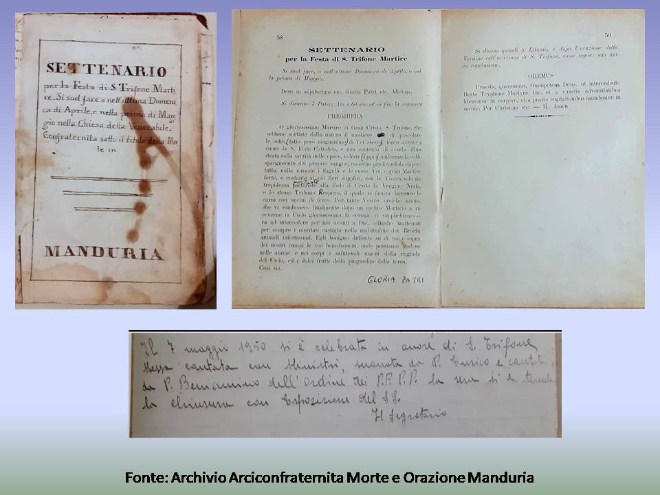 Archivio storico del Comune di Manduria; Archivio Arciconfraternita della Morte ed Orazione (si ringrazia il Priore, sig. Salvatore Distratis per la disponibilità).