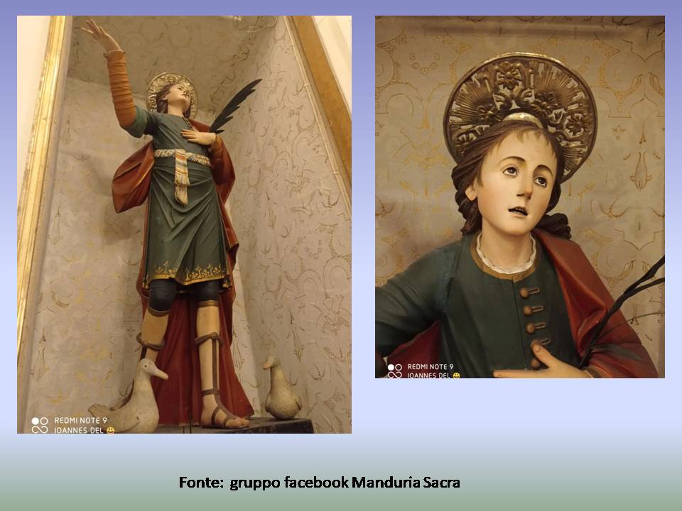 Per quanto riguarda la processione, il Tarentini scrive che una prima statua del santo fu commissionata nel 1784, mentre quella attuale, collocata lungo la navata destra della chiesa di Santa Lucia, fu commissionata nel 1796 a uno scultore di Ostuni, con una spesa di «ducati 47 e grana 10. Nello stesso anno 1796, nei costi del relativo esercizio finanziario, risulta una spesa di ducati 0.98 ¼ «per messa cantata in onore di S. Trifone».
