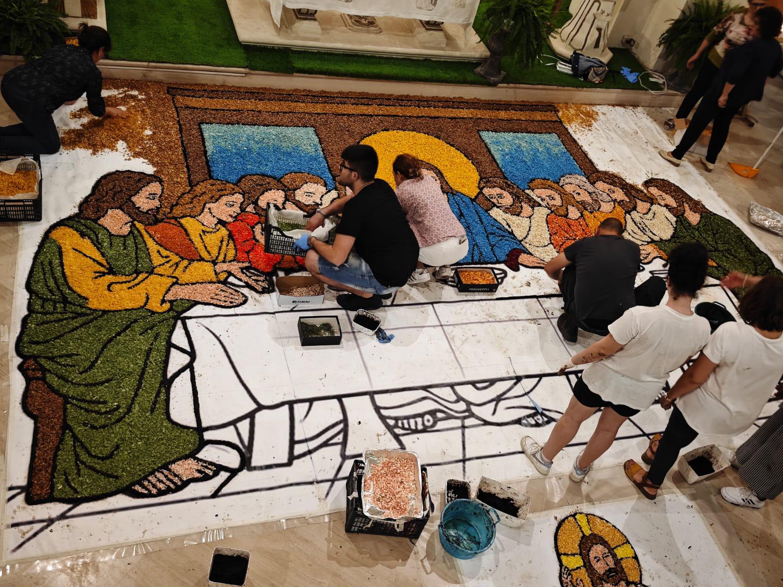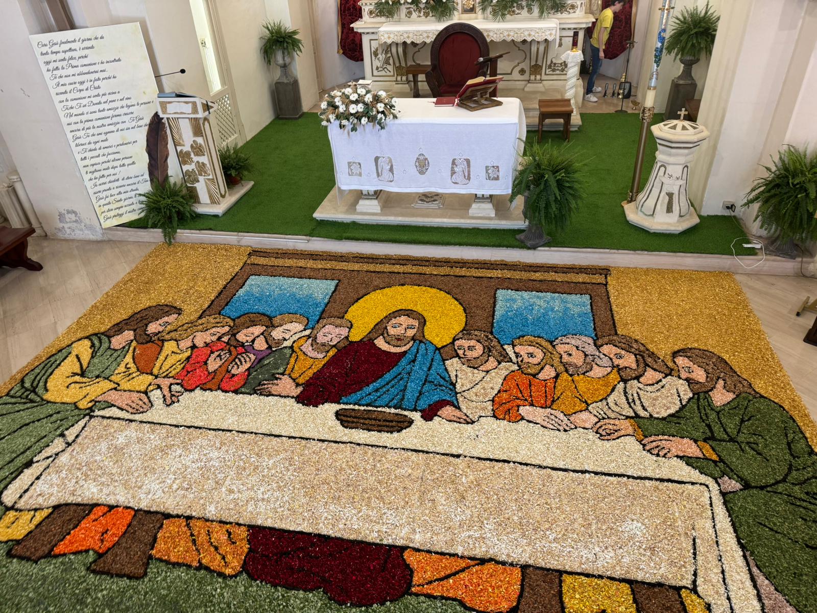 I lavori di preparazione sono iniziati già da lunedì e hanno coinvolto adulti, ragazzi e bambini in un cantiere creativo in cui ogni dettaglio è frutto di dedizione e cura. Nulla è lasciato al caso: dalla scelta delle cromie, pensate per valorizzare i soggetti sacri e i simboli eucaristici, alla meticolosa composizione scenografica del tappeto floreale.