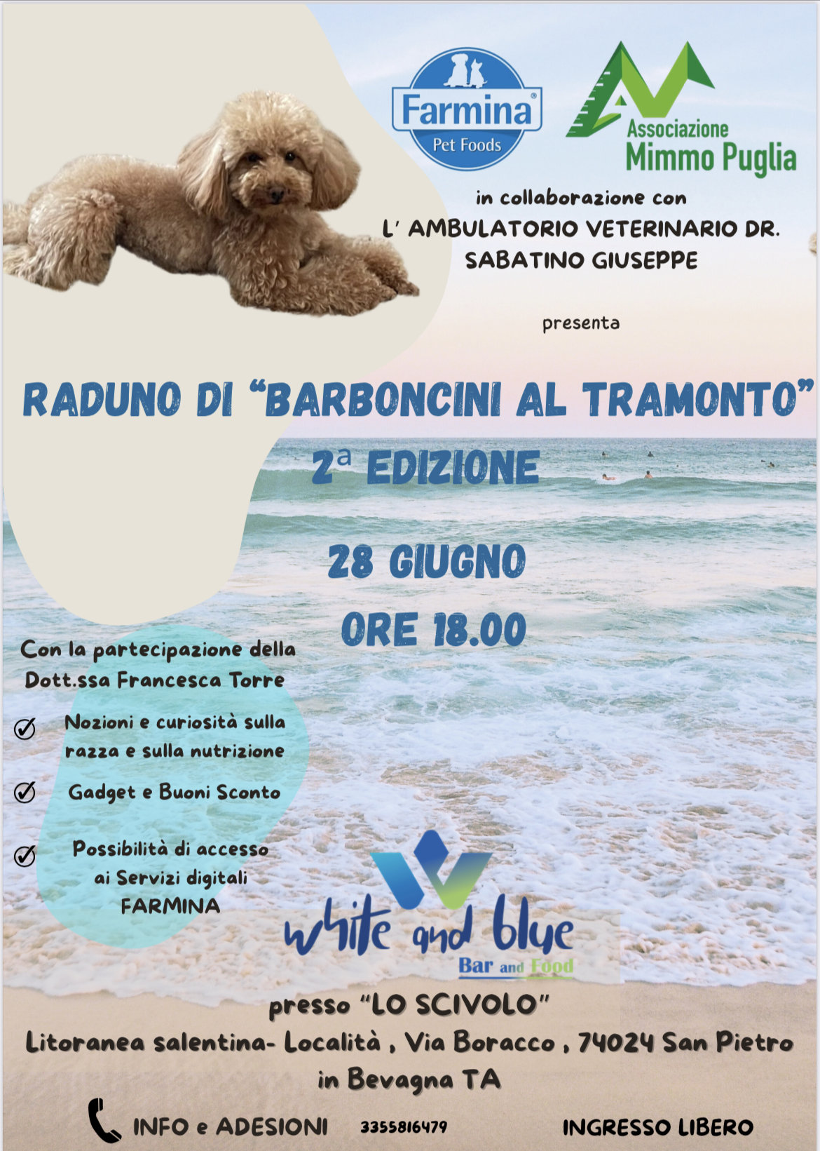 Si svolgerà sabato prossimo (28 giugno) la seconda edizione del raduno di “Barboncini al tramonto”, promosso congiuntamente dall’associazione “Mimmo Puglia” e da Farmina.