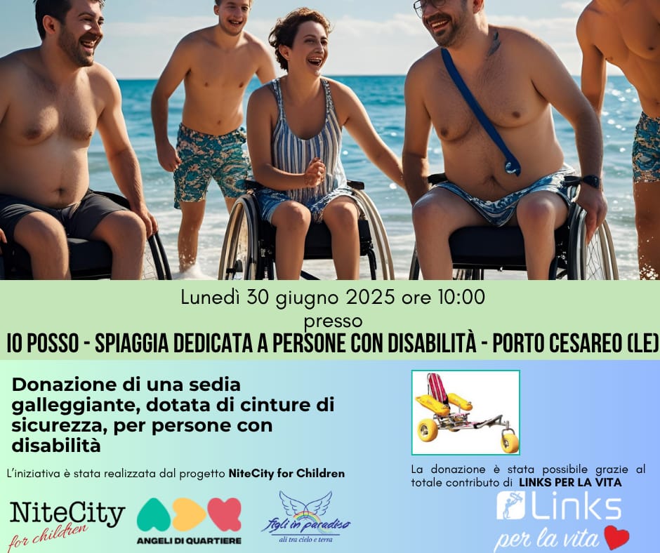 Il 30 giugno prossimo, alle ore 10, presso la spiaggia “Io Posso” dedicata alle persone con disabilità, si terrà la cerimonia di consegna ufficiale di una sedia galleggiante dotata di cinture di sicurezza, un ausilio fondamentale per garantire l’accesso al mare in piena sicurezza e autonomia anche a chi vive una condizione di disabilità.
