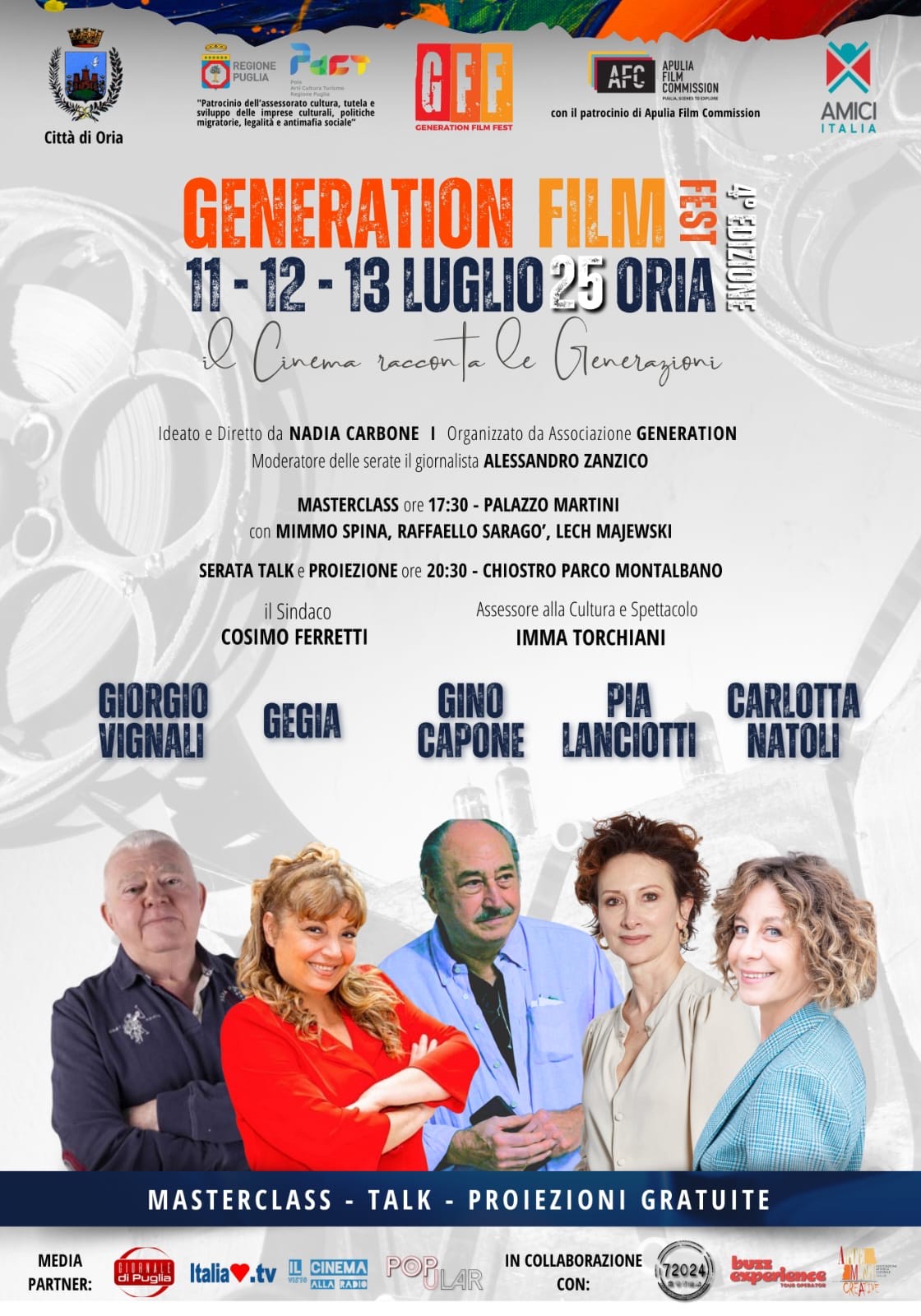 Dall’11 al 13 luglio, la città di Oria ospita la quarta edizione del Generation Film Fest, appuntamento ormai riconosciuto nel panorama culturale pugliese. Un festival che celebra il cinema italiano come ponte tra epoche, visioni e comunità, capace di coinvolgere nuove generazioni e valorizzare la memoria culturale del nostro Paese.