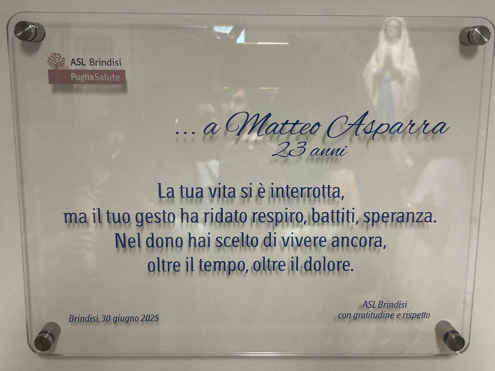 La Asl Brindisi ha voluto ricordare con questa targa, all’esterno della cappella dell’ospedale Perrino, Matteo Asparra, un ragazzo di Mesagne di 23 anni, che ha donato i suoi organi a fine aprile. Momenti di grande commozione nella cerimonia che si è tenuta questa mattina: erano presenti i genitori Marcello, dipendente Asl, e Anna, il fratello Alessio con la fidanzata Brenda, il cugino Gabriele, lo zio Maurizio e altri familiari. Accanto a loro, il direttore generale Maurizio De Nuccio, il sindaco di Mesagne, Toni Matarrelli, i primari di Rianimazione, Massimo Calò e di Nefrologia, Luigi Vernaglione, la responsabile aziendale delle attività di prelievo Ada Patrizio, la coordinatrice territoriale donazione e trapianto Area Vasta Sud Lucia Argentiero e Dorina Piliego, presidente Aido Brindisi. Presenti anche Mina e Michele Tagliente, promotori dell'associazione Lo Sportello di Mattia, dedicata al figlio e creata con l’obiettivo di sensibilizzare i cittadini sulla cultura della donazione.