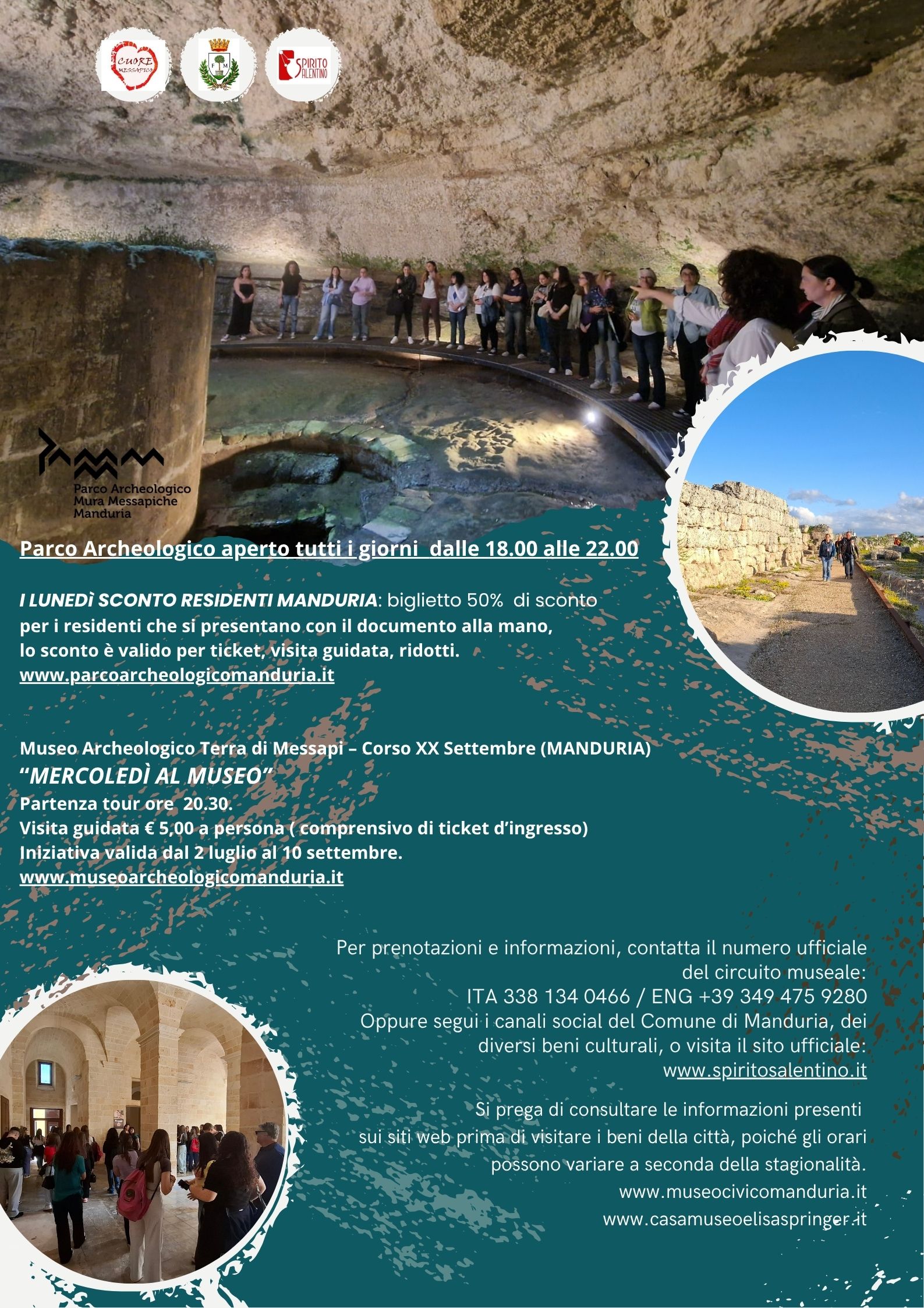 Novità di quest’anno:Tutti i lunedì, sconto speciale per i residenti di Manduria: avranno diritto a uno sconto del 50% sul biglietto, sempre comprensivo di visita guidata!