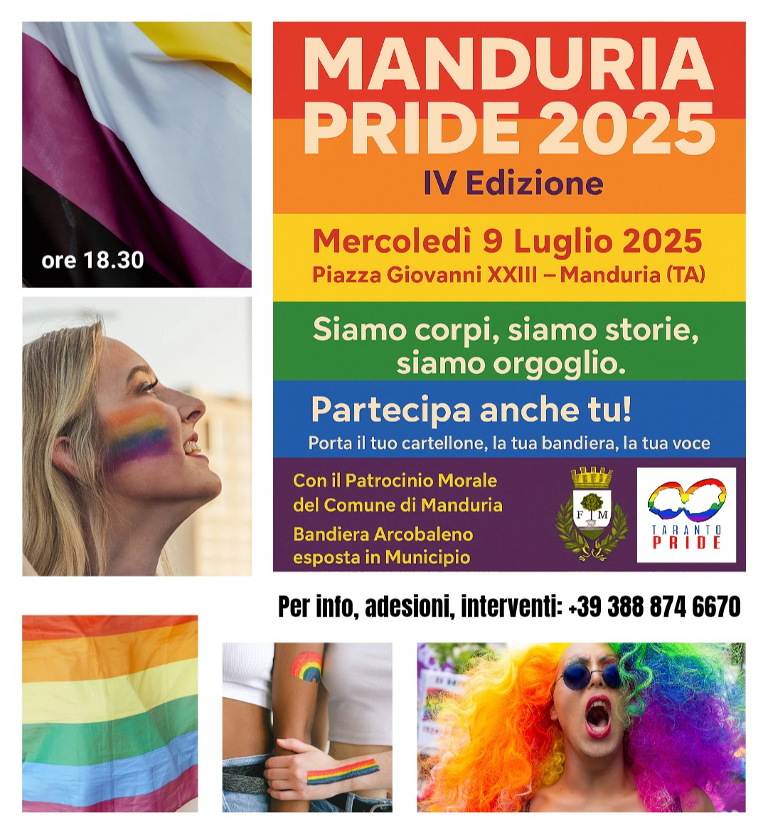 «L’iniziativa, inserita in appendice alla Taranto Pride Week e organizzata dalla rete Taranto Pride Net, gode anche quest’anno del patrocinio morale del Comune di Manduria, che ha deciso di esporre la Bandiera Arcobaleno in Municipio: un gesto simbolico ma potente, che parla di accoglienza, di rispetto e di coraggio istituzionale» è riportato in un comunicato.