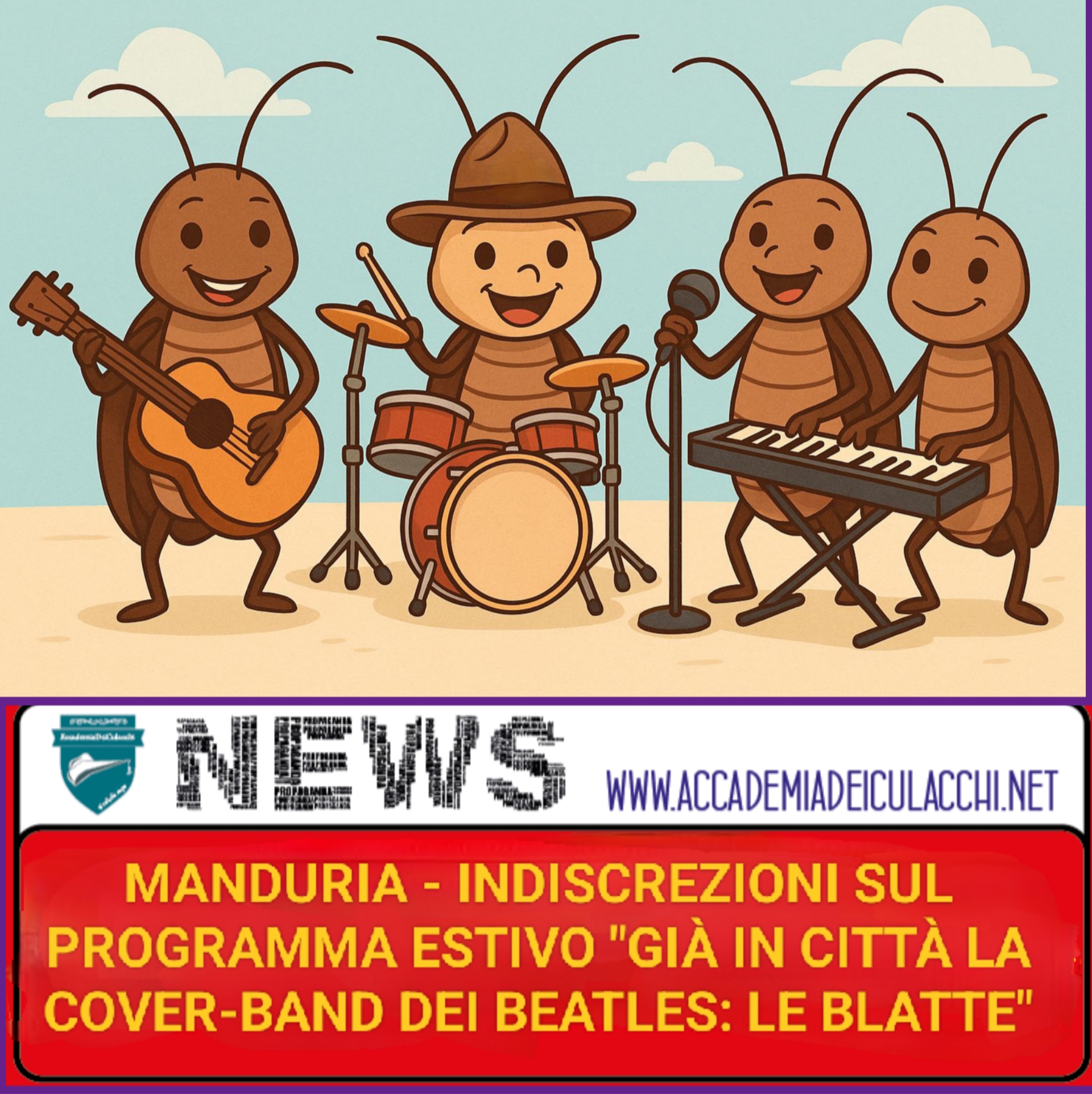 Sempre più pungente la venerabile Accademia dei Culacchi del Manduria, che, in esclusiva, ha reso noto in mattinata una indiscrezione sul cartellone estivo dei concerti. In città si esibirà la band “Le blatte”, cover band del gruppo dei Beatles, la cui traduzione dall’inglese è, appunto, “scarafaggi”.
