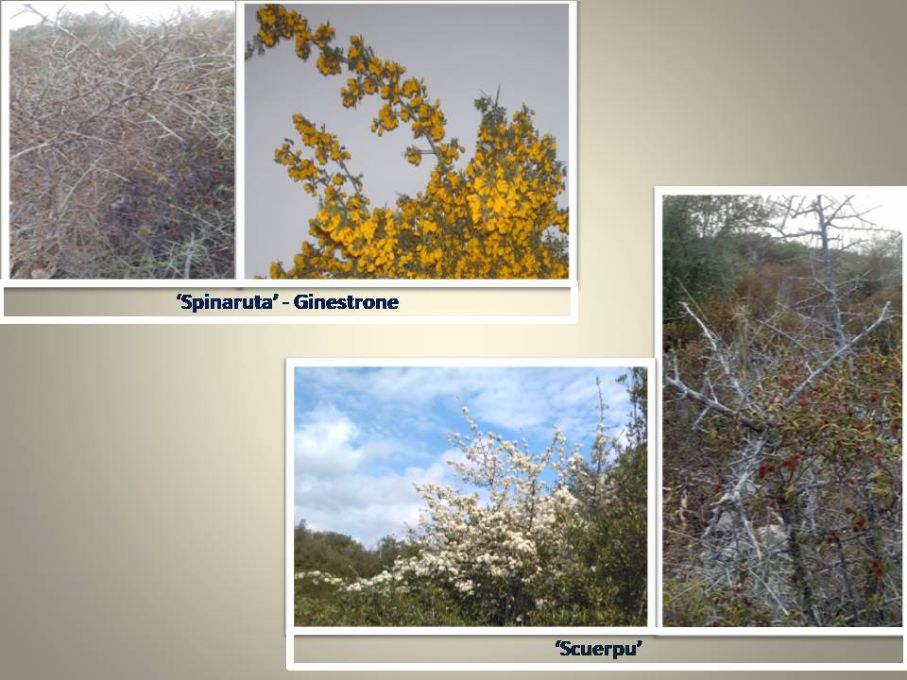 La ‘spinaruta’ è identificabile con la ‘Calicotome infesta’ o ‘Sparzio spinoso’. È un arbusto che vive spontaneo nelle zone macchiose e fiorisce tra marzo e maggio. Il nome dialettale ne coglie l’aspetto fortemente spinoso. È conosciuta anche come ‘ginestrone’.