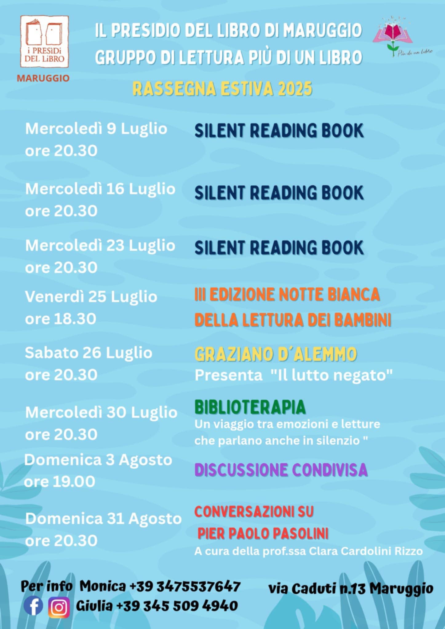 Pubblichiamo anche la locandina dell’intero programma di iniziative culturali Presidio del Libro di Maruggio che avranno luogo nel corso di questa estate.