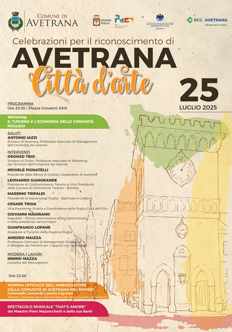 «Venerdì 25 luglio, alle ore 20:30 in piazza Giovanni XXIII, festeggeremo insieme il prestigioso riconoscimento di “Città d'Arte”, conferito dalla Regione Puglia al nostro amato territorio» annuncia il sindaco Antonio Iazzi.