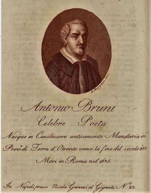 L’autore, dopo aver menzionato le personalità illustri che hanno operato nel Regno di Napoli (nella Penisola Salentina Ennio e Pacuvio; in Lucania Orazio; Ovidio in Abruzzo; a Napoli Giacomo Sannazzaro, Torquato Tasso, Giovanbattista Marino e, fra le donne, Claudia, valente musicista, moglie del poeta Papinio Stazio, Dorotea Acquaviva, la marchesa Vittoria Colonna, Laura Terracina), passa a scrivere di Manduria «oggi Casal Novo, Giardino delizioso de’ Salentini (…) e Madre feconda d’Uomini non meno versati nell’esercizio dell’armi, che nel mestier delle lettere», descrivendo dapprima il «meravigliosissimo Fonte» citato da Plinio il Vecchio nella sua ‘Naturalis Historia’, poi illustrando la progenie di Antonio Bruni. Apprendiamo che i suoi genitori furono Giulio Cesare Bruni e Isabella Pasanisi e che Antonio fu l’ultimo di otto fratelli.