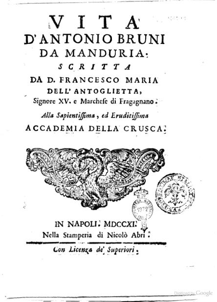 Nella Biblioteca Nazionale di Firenze è custodito un prezioso volume contenente la biografia di un illustre letterato della nostra città. Si tratta di “Vita D’Antonio Bruni da Manduria”, scritta da D. Francesco Maria Dell'Antoglietta, signore XV e marchese di Fragagnano e indirizzata 'Alla Sapientissima, ed Eruditissima ACCADEMIA DELLA CRUSCA’.