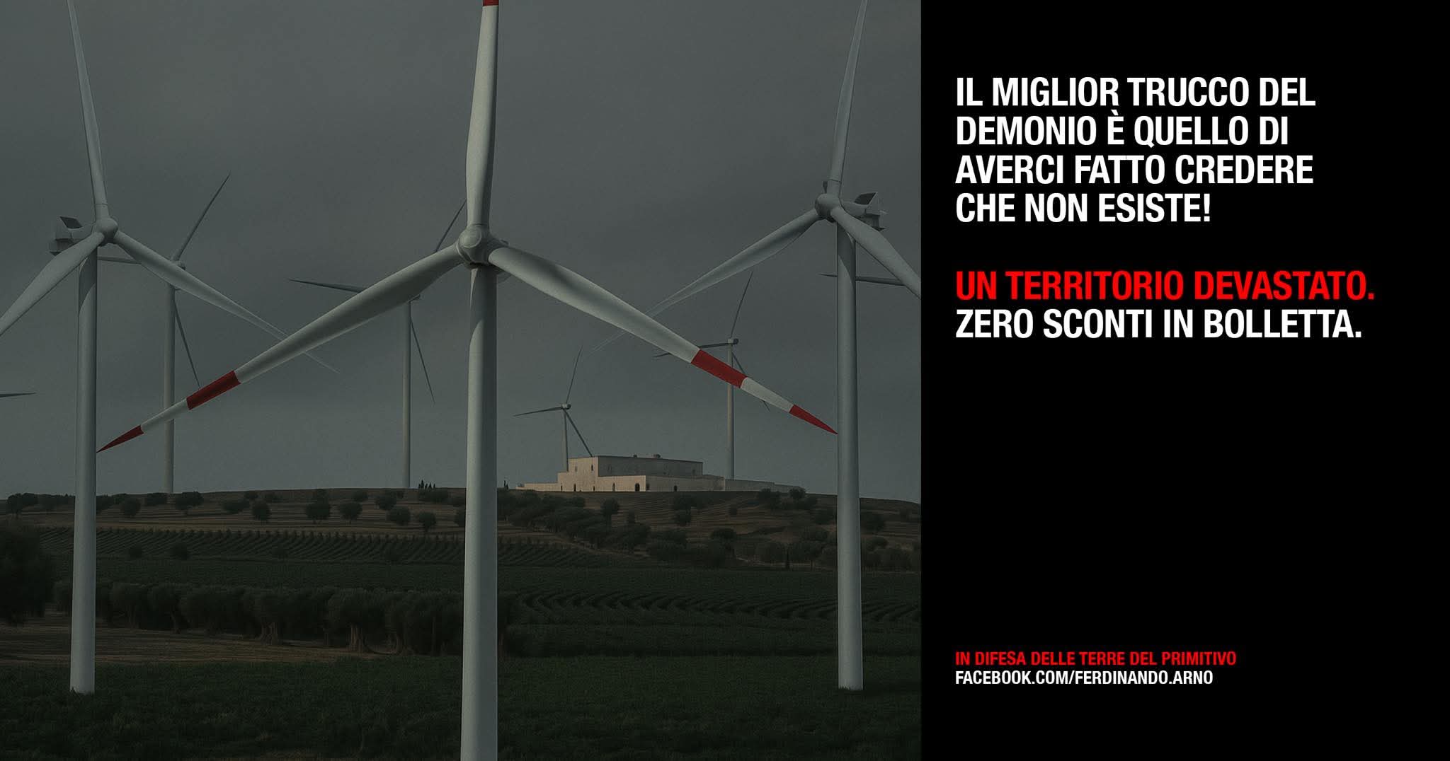 Le vigne, le masserie, il paesaggio che definisce l’identità di questa terra vengono barattati per nulla: nessuno sconto in bolletta, solo deturpazione.