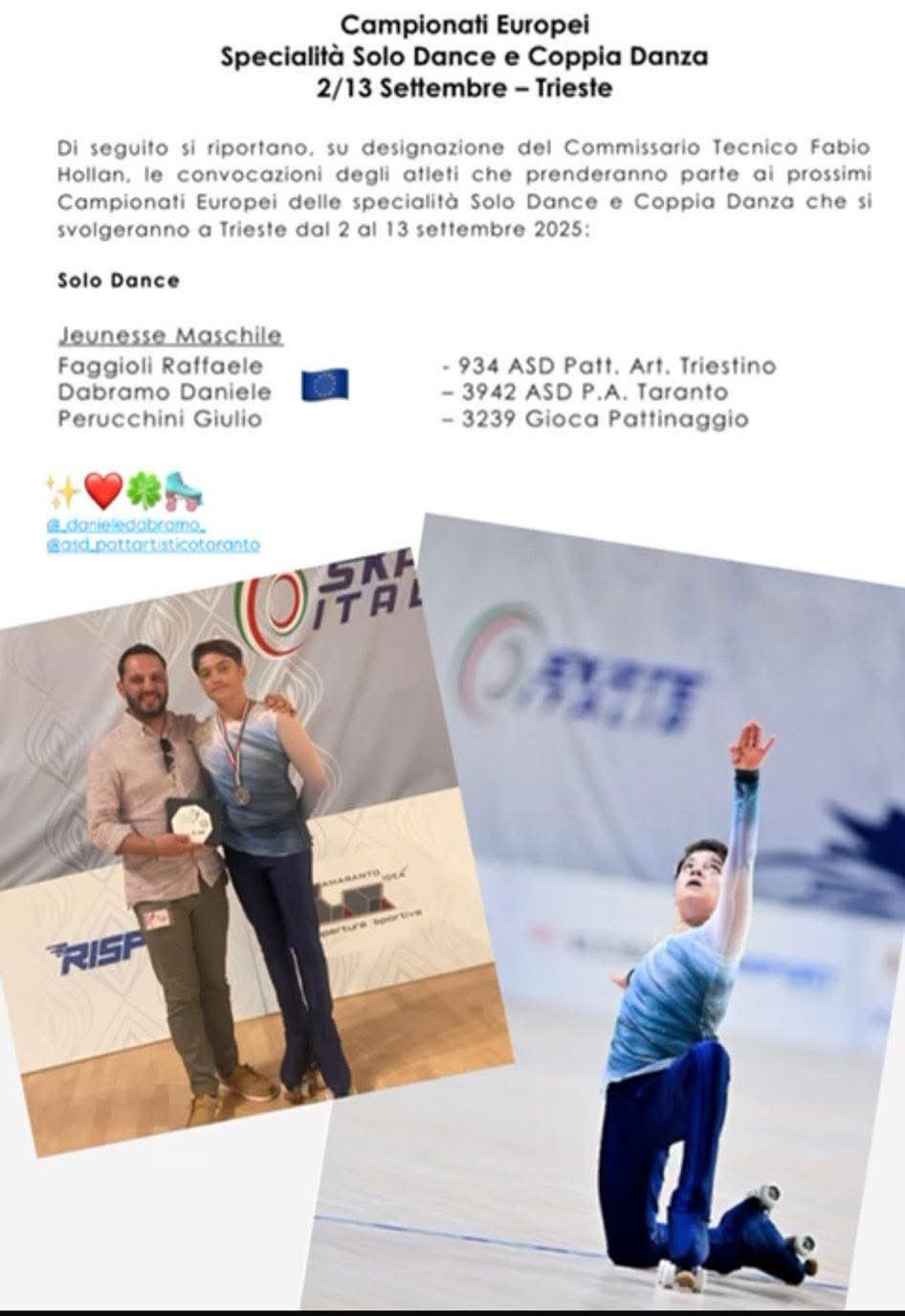 Daniele Dabramo della Asd Pattinaggio Taranto conferma la sua prestazione del campionato italiano con la convocazione al campionato europeo di pattinaggio artistico specialità solo dance.