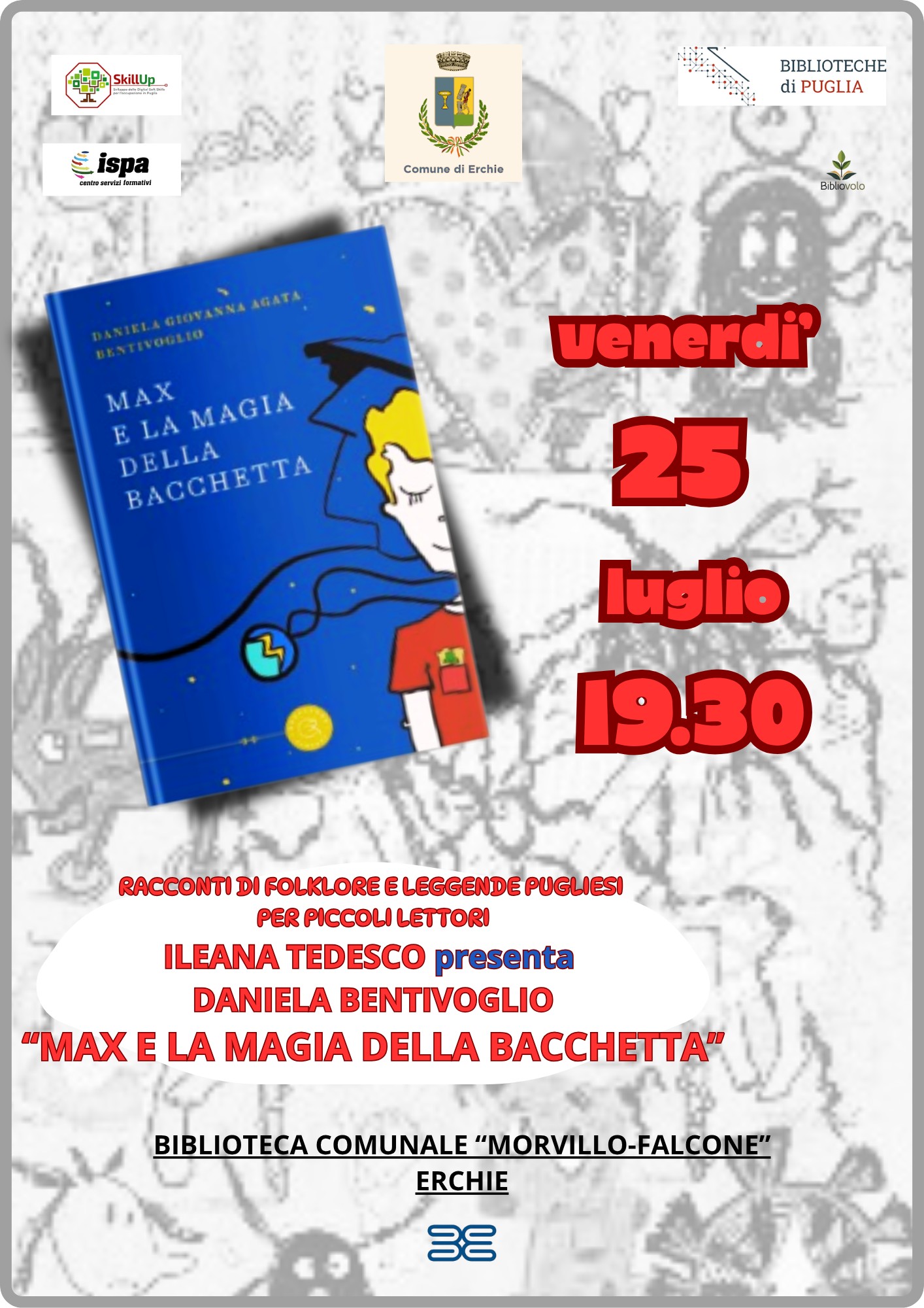 Daniela Giovanna Agata Bentivoglio, con la collaborazione di Ileana Tedesco, presenterà il romanzo di formazione magica “Max e la magia della bacchetta”, un prezioso contenitore delle storie del folklore del nostro territorio, annodate in un unico racconto di scoperte e fantasia di un gruppo di ragazzini alla ricerca del loro passato.