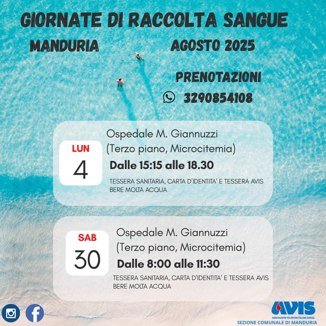«Porta con te tessera sanitaria, carta d’identità e tessera AVIS… E ricordati di bere molta acqua!» l’invito di AVIS Manduria. «Prenota al: 3290854108. Dona il sangue, regala la vita!».