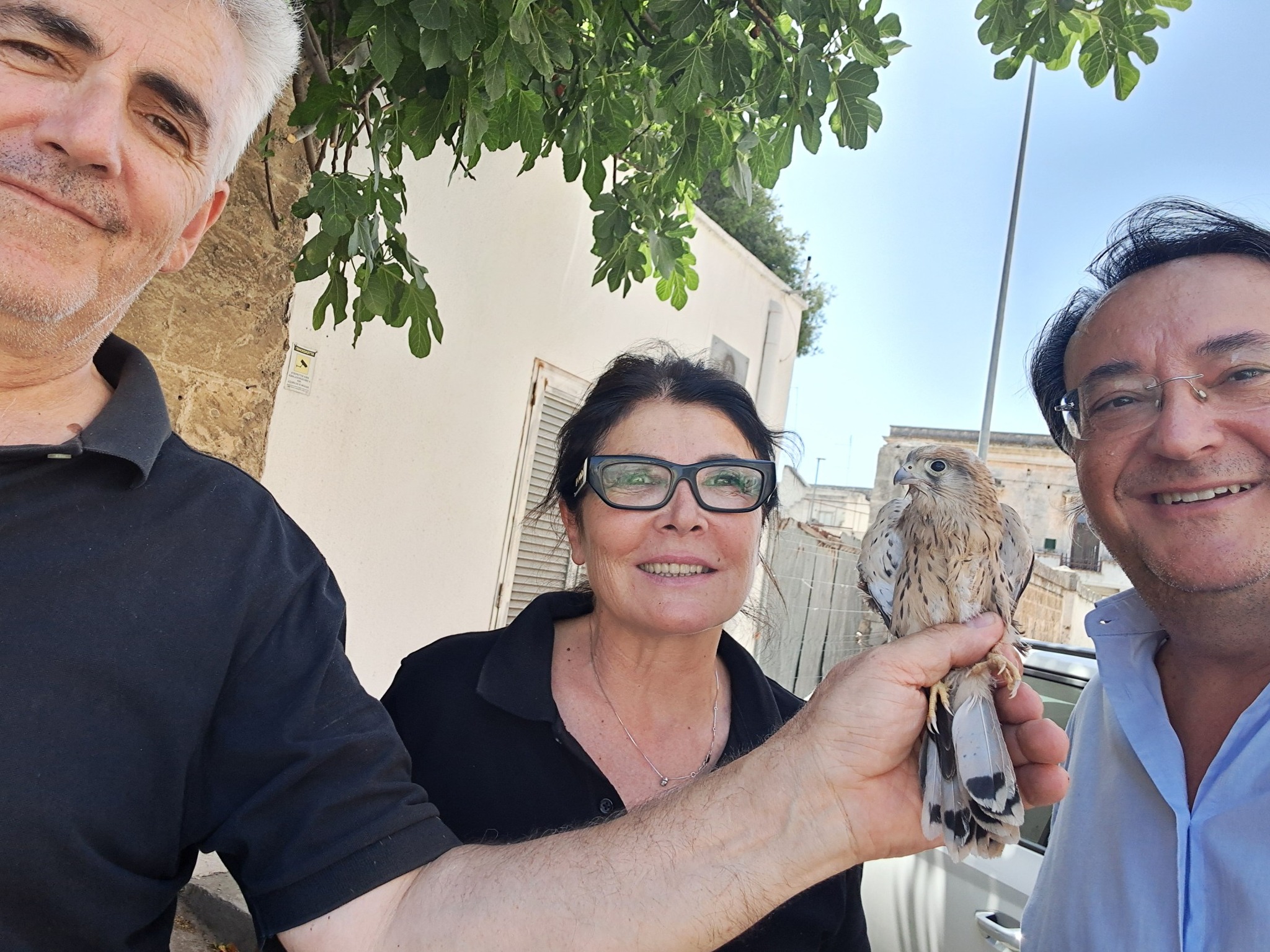 In una foto condivisa da Matino su Facebook, si vede il falchetto tenuto con delicatezza mentre Mimma Malorgio e il dott, Fontana sorridono, visibilmente sollevati.