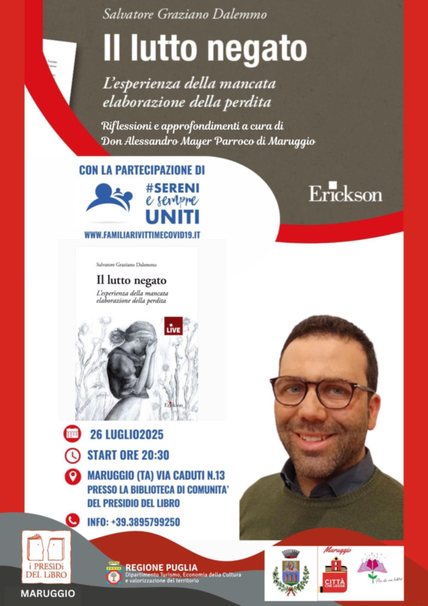 Avrà luogo domani sera, presso la sede del Presidio del Libro Maruggio, Gruppo di Lettura Più di un Libro (in via Caduti 13), alle ore 20,30, la presentazione del libro “Il lutto negato” di Salvatore Graziano Dalemmo (edizioni Erikson).