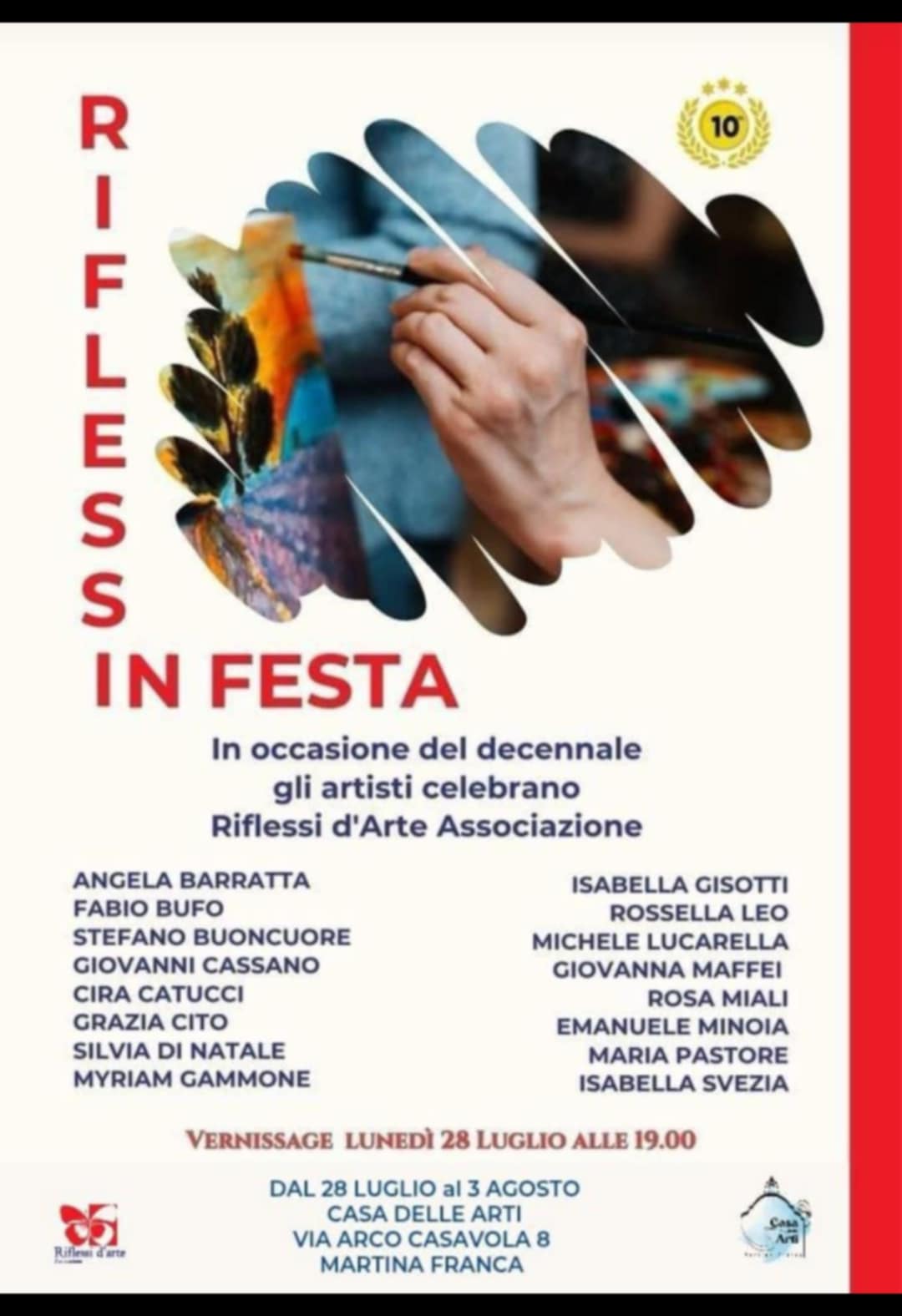 Sarà inaugurata domani sera, alle 19, la collettiva “Riflessi in festa”, allestita a Martina Franca su iniziativa dell’associazione Riflessi d’Arte presso la sede di Casa delle Arti, in via Arco Casavola 8.