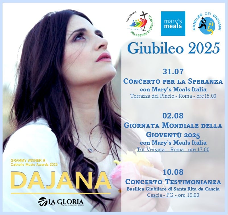 Il suo cammino giubilare inizierà il 31 luglio con il Concerto per la Speranza, che si terrà nella splendida cornice della Terrazza del Pincio a Roma. L’evento è organizzato e promosso a sostegno di Mary’s Meals International, organizzazione umanitaria che ogni giorno fornisce un pasto scolastico a oltre 2 milioni di bambini nei contesti più poveri del mondo. Un legame forte quello con Mary’s Meals: Dajana, ambasciatrice italiana del progetto, ha già sostenuto la costruzione di una mensa scolastica in Malawi attraverso il brano e il videoclip Figli della Luce.
