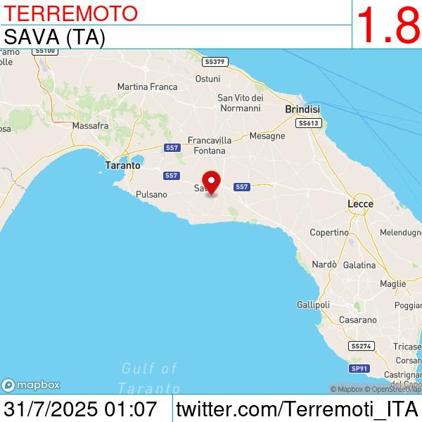 Lieve scossa di terremoto con epicentro a Sava la scorsa notte, precisamente all’1:07, con magnitudo 1.8 gradi.