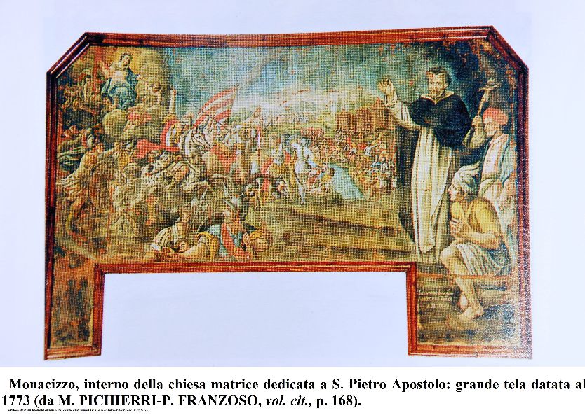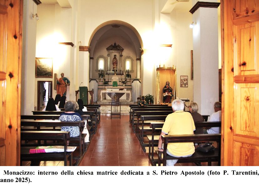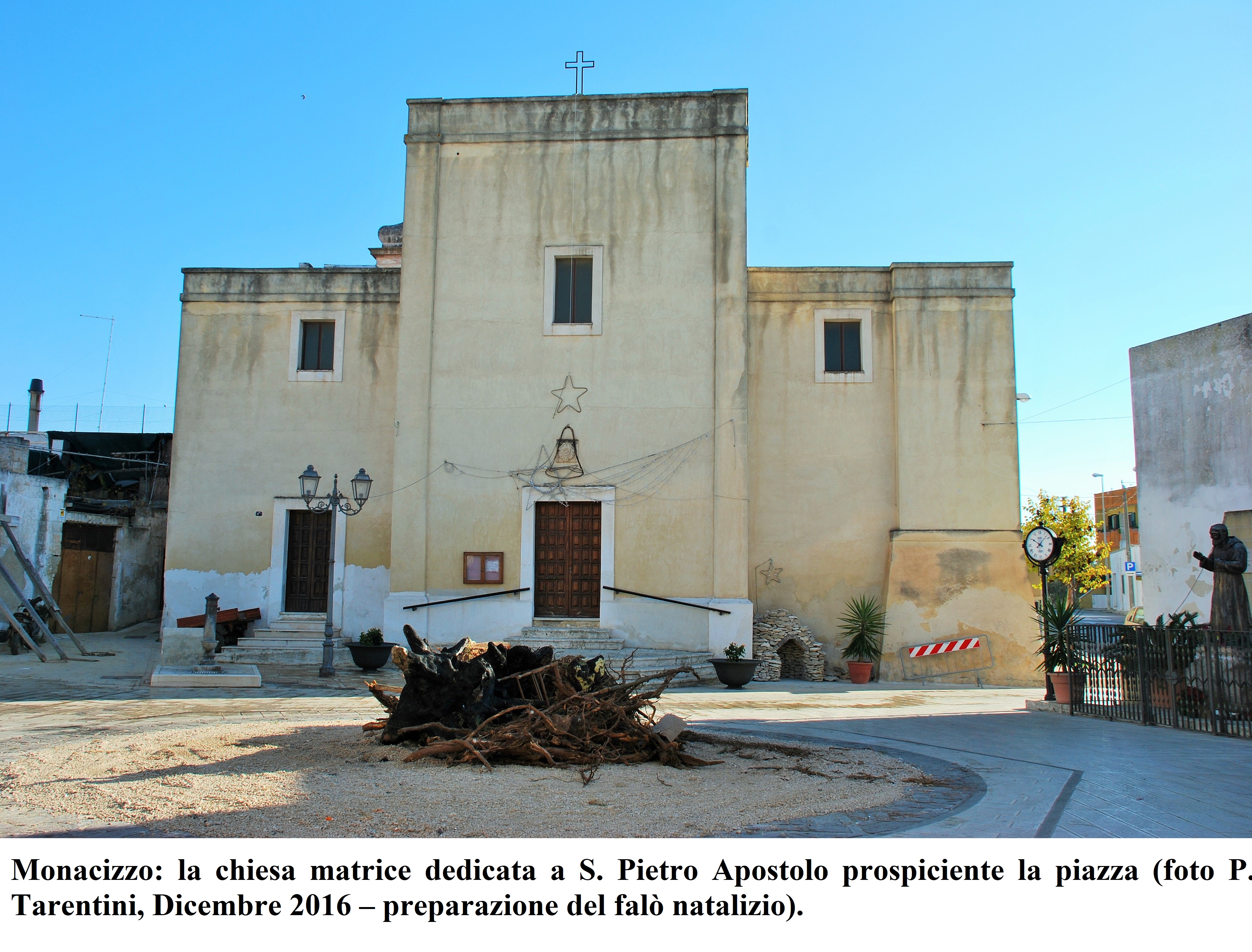 Tale condizione si riflette nella visita di mons. Francesco Pignatelli (1685) che segnala, in Monacizzo, un casale importante su questo versante orientale e, quindi, da visitare per primo; la chiesa è indicata sotto il titolo di S. Pietro la Fossa, ubicata sul lato orientale della Terra (cioè del paese), nei pressi della “Porta australe” (cioè meridionale), con facciata rivolta ad occidente; vi è descritto l’altare Maggiore, ad oriente, l’altare della SS. Vergine del Monte Carmelo (con a lato le immagini di S. Vito e S. Trifone), poi l’altare della Beatissima Vergine Maria del Rosario e di altri Santi (a mezzogiorno), con le statue dei misteri collocati all’intorno; si aggiungono due altri altari a settentrione, di cui, quello ad est, con immagine di S. Pietro la Rossa; si segnala il fonte battesimale e il campanile con due campane; vi celebrano un Arciprete e tre sacerdoti con tre chierici.