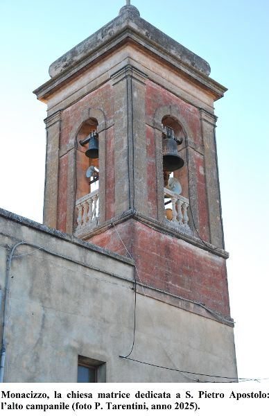 Un’ultima data, infine (1939) è segnalata su una delle tre campane dell’alto campanile, insieme ad una scritta che richiama personaggi (Papa Pio XII, Re Vittorio Emanuele III, Il Duce Benito Mussolini, l’Arcivescovo di Taranto Ferdinando Bernardi, l’Arciprete di Monacizzo Eugenio Ferri), legati ad eventi storici di un passato recente, vissuto dai nostri nonni e dai nostri padri (vedi Chiesa Madre di San Pietro Apostolo, sito internet, Guida Torricella, da Wiki):