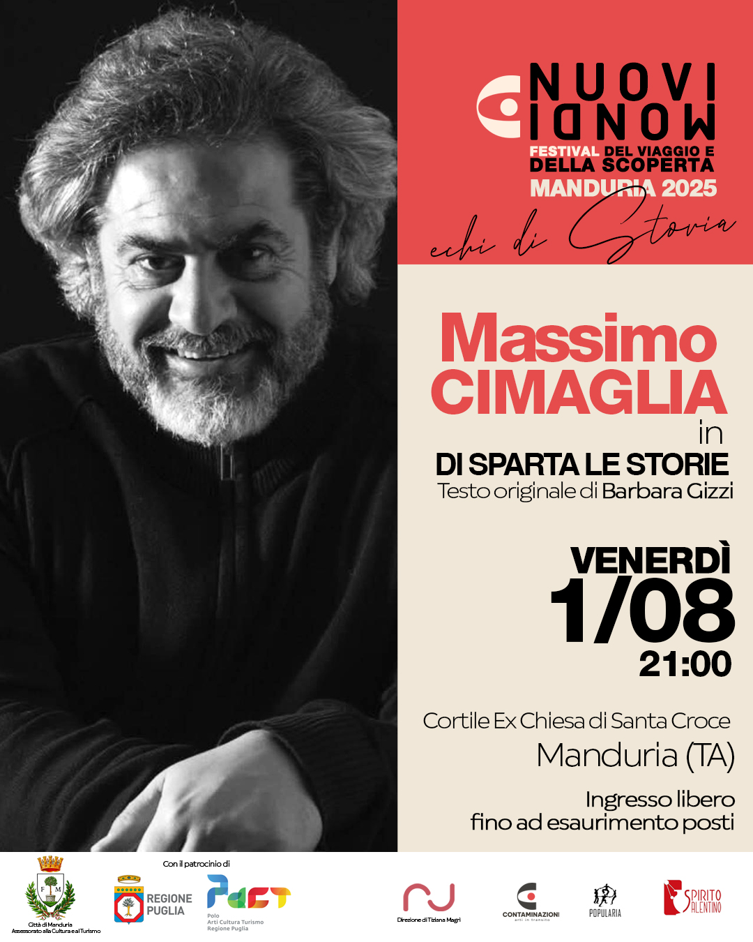 Alle ore 21, nel suggestivo cortile dell’ex chiesa di Santa Croce a Manduria, Massimo Cimaglia sarà protagonista della prima regionale dello spettacolo “Di Sparta le Storie”, scritto da Barbara Gizzi: un reading teatrale con proiezioni che porta in scena un viaggio tra mito e identità, radici e destino, attraversando l’epica spartana e la fondazione di Taranto, l’unica colonia spartana d’Occidente.