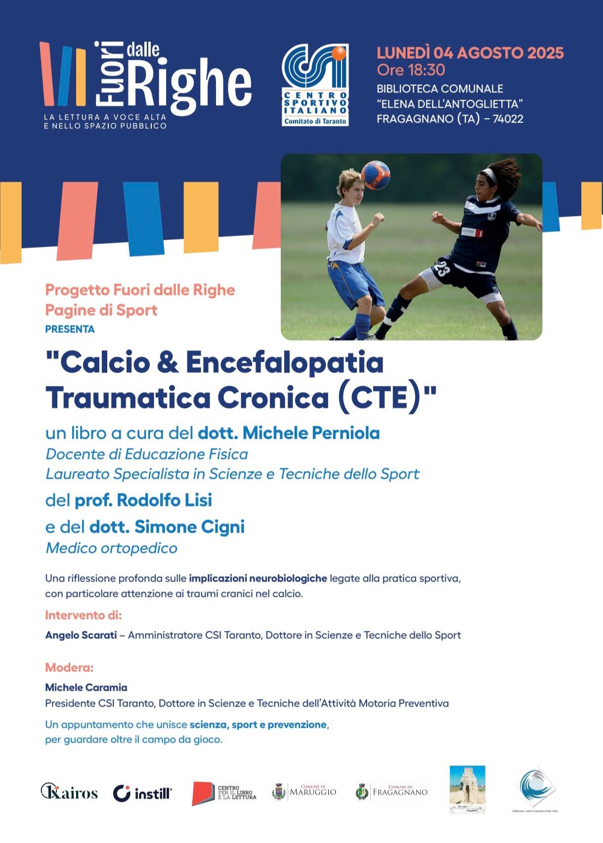 Lunedì 4 agosto, alle ore 18:30, la biblioteca comunale “Elena dell’Antoglietta” di Fragagnano ospiterà l’incontro “Calcio & Encefalopatia Traumatica Cronica (CTE)”, promosso nell’ambito del progetto Fuori dalle Righe – Pagine di Sport, a cura del CSI – Comitato Provinciale di Taranto.