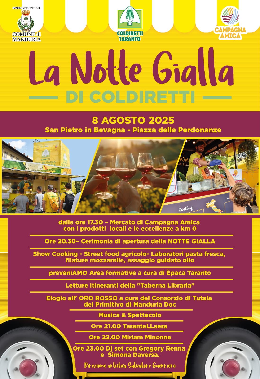 Domani sera, in piazza delle Perdonanze, la Notte Gialla di Coldiretti. Una vetrina dei prodotti locali e delle eccellenze a km 0, ma non solo. Ecco il programma completo.