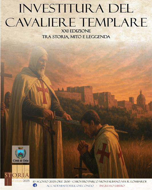 Torna a Oria, nella cornice naturale del Parco Montalbano, la rievocazione dell’Investitura del Cavaliere Templare, giunta alla sua XXI edizione, con uno spettacolo che intreccia storia, simboli e memoria cavalleresca. L’evento è promosso dall’Accademia Federico II APS con il patrocinio della Città di Oria, è ad ingresso gratuito e rientra nel cartellone “stORIA d’Estate 2025” promosso dalla medesima associazione.