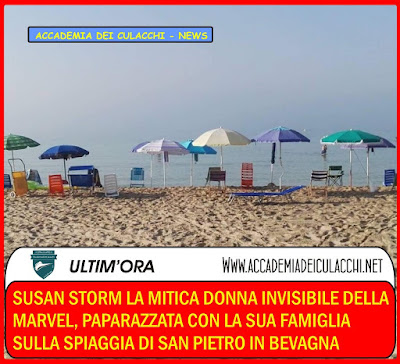 Susan Storm la mitica Donna Invisibile della Marvel, paparazzata con la sua famiglia sulla spiaggia di San Pietro in Bevagna.